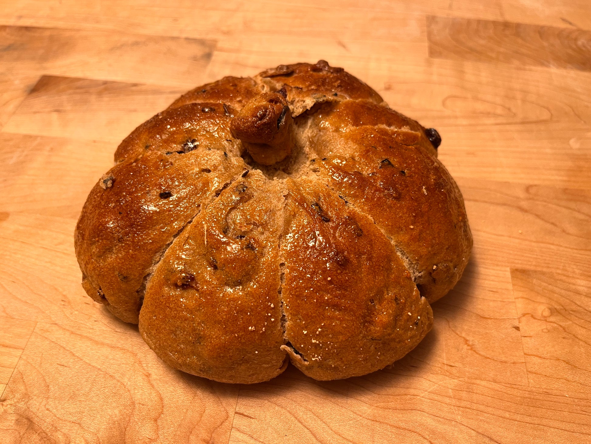 Loaded with seasonal flavor, this oat/barley multigrain bread is plump with dried cranberries, toasted almonds and sweetened with a splash of maple syrup. Serve warm on a platter as a pull-apart pumpkin shaped bread for Thanksgiving or warm up post Thanksgiving morn and serve with eggs and fresh fruit.